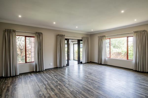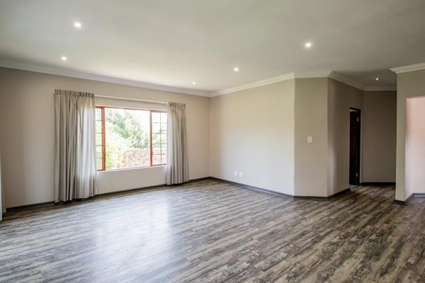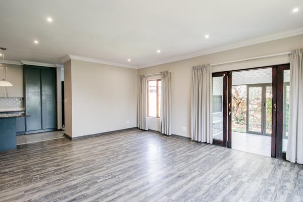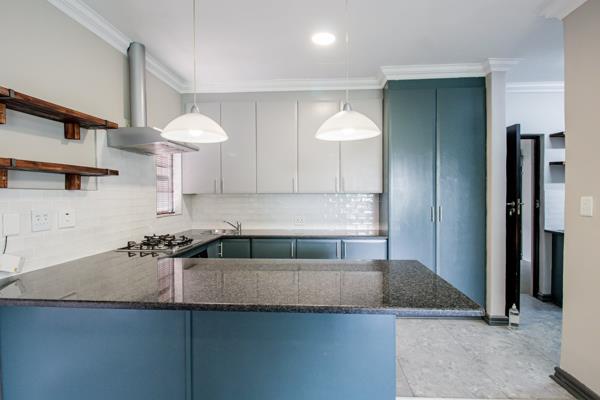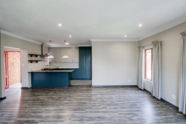 Enter this spacious and modern home through a small entrance hall into the spacious open-plan dining room, lounge and kitchen. The lounge opens up onto an enclosed patio with built-in braai overlooking the spacious garden. The patio has stacked doors that open up onto the spacious garden. The two-tone kitchen is modern and beautiful with a lot of cupboard space, granite tops, a gas hob, an electric oven and a separate scullery with enough space for all your appliances.