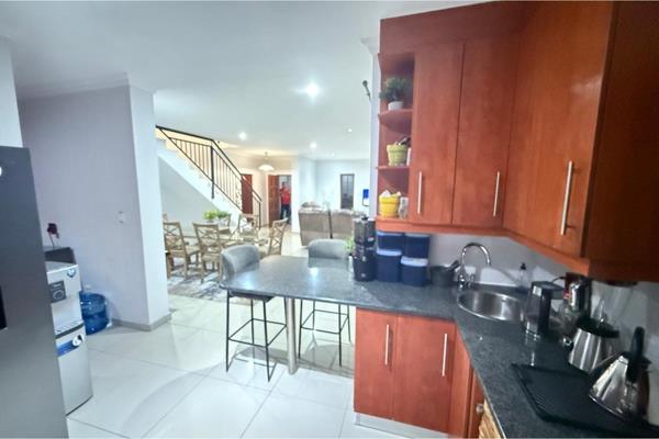 The kitchen is modern and fully equipped, boasting tiled floors, built-in cupboards, a hob, oven, and extractor fan. A gas stove and granite countertops add a touch of sophistication. The adjoining scullery is similarly finished with granite tops, built-in cupboards, and a double sink. The dining area is bright and welcoming, enhanced with tiled floors and elegant downlights, while the lounge offers a comfortable space for relaxation. The home also features a patio with a built-in braai, perfect for entertaining guests.