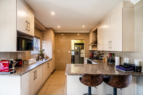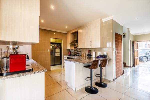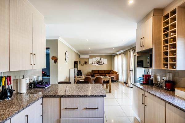 The modern kitchen is a highlight, featuring light cabinetry, gleaming granite countertops, a stylish mosaic tiled backsplash, and a breakfast bar. Equipped with a built-in oven, gas hob, stainless steel extractor, and a wine rack, it caters to all culinary needs. Upstairs, three comfortable bedrooms include a luxurious en-suite master, alongside 2.5 well-appointed bathrooms, including a guest toilet. Bedrooms offer modern finishes, air conditioning, and ample natural light. Outside, the private garden provides a spacious green retreat, perfect for family activities. A patio with a built-in braai extends the living space outdoors, ideal for entertaining. This pet-friendly home ensures a balanced indoor-outdoor lifestyle.