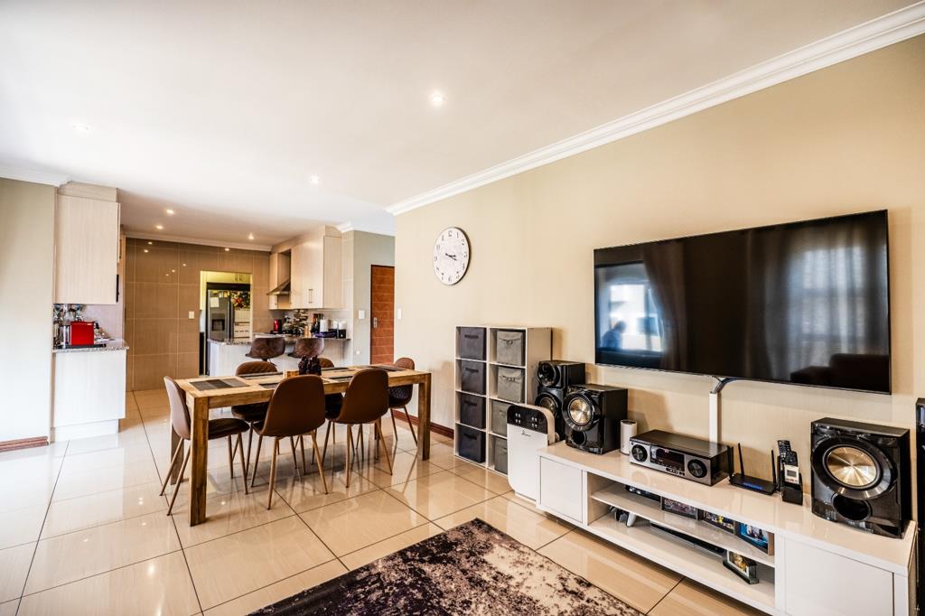 This contemporary two storey residence, nestled within the sought after Thatchfield Hills security estate in Centurion, offers an exceptional family lifestyle with access to a golf course. The property boasts appealing kerb appeal with its modern grey stucco exterior, tiled roof accents, and a paved front area leading to an integrated double garage. Step inside to discover an inviting open plan living environment, seamlessly connecting the lounge, dining area, and a dedicated family TV room, with aircon. This bright space features sleek tiled flooring, elegant crown molding, recessed lighting, and large sliding glass doors opening to the outdoor patio.