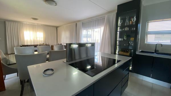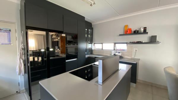 The home features tiled floors throughout and a spacious open-plan kitchen fitted with built-in cupboards, a central island, and premium owner-installed Smeg electric stove, oven, and microwave. A granite basin adds a sleek, contemporary touch to the kitchen. The open-plan layout flows effortlessly into the living area, ideal for comfortable family living and entertaining. A guest toilet is conveniently located on the ground floor.