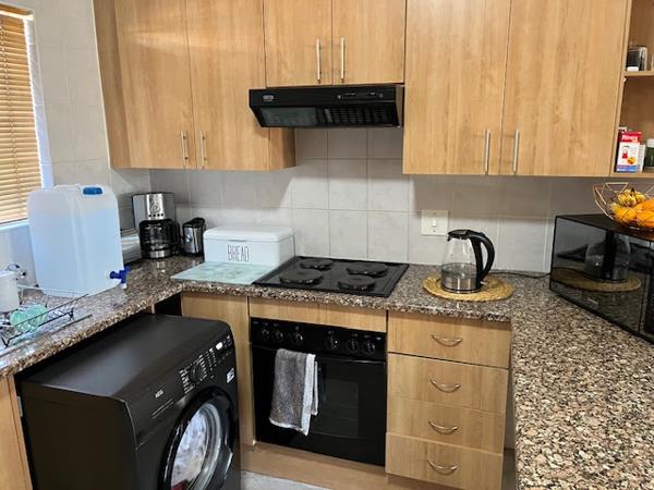 Elegant living in safe and secure complex. Sadly no cats allowed. Max 2 small dogs might be considered. Access via biometrics or access code. This stunning property has amazing views of the sunsets. 3 bedrooms, master has en suite and two other bedrooms share a full bathroom. Downstairs you will find a guest toilet with basin. Ample cupboards with Additional storage space under stairs. Open plan living at its best - kitchen flowing into dining area onto lounge and if you open sliding doors you can dine alfresco in your own private garden.Garden is small but manageable. Access from garage to garden and house. Double garage completes the home. A small shopping mall with Woolies and Checkers as anchor tenants are walking distance from the complex.