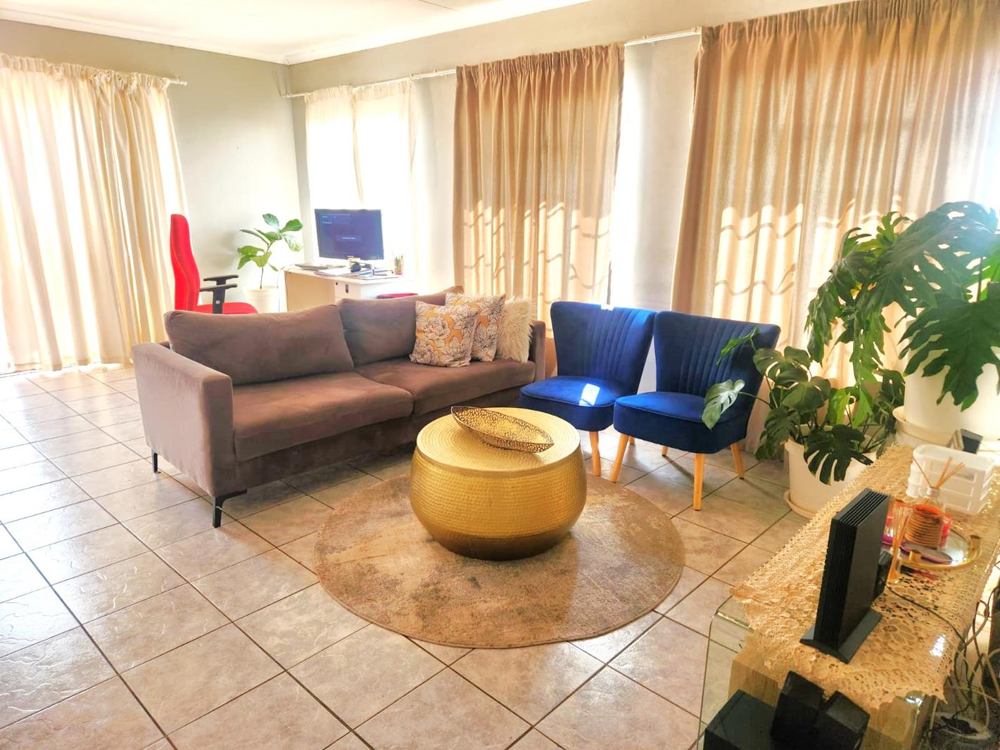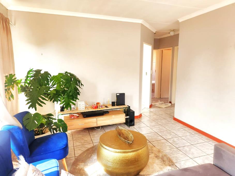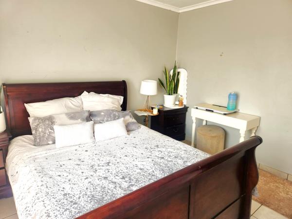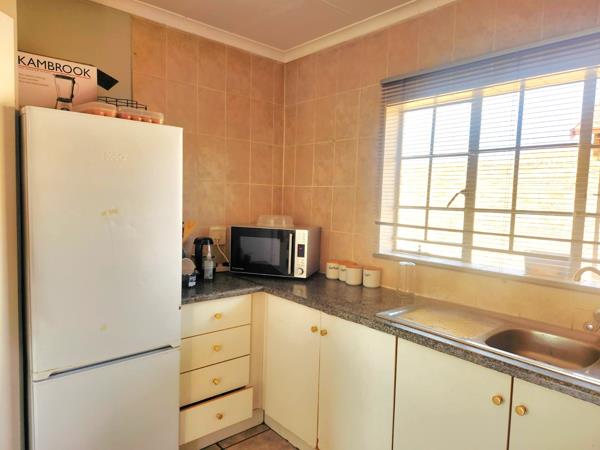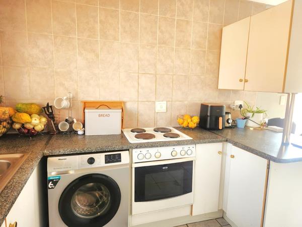 The home features a light-filled open-plan living area, tiled throughout for easy upkeep, and a practical kitchen fitted with built-in cupboards, a pantry, double sink, and a 4-plate electric stove.