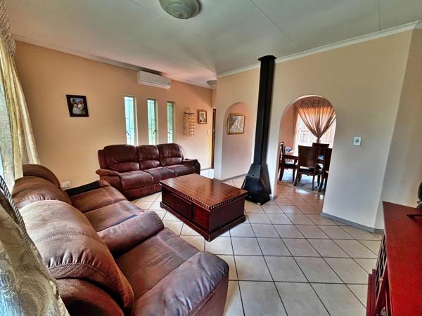 Upon entering through a tiled foyer, you are welcomed by a grand sitting room with a nice fireplace , the sitting area that flows into a spacious, open-plan reception area. The elegantly tiled dining area opens to a generous lounge and kitchen. The kitchen features beautiful tiles and is equipped with ample light wood cabinetry and stunning granite countertops.