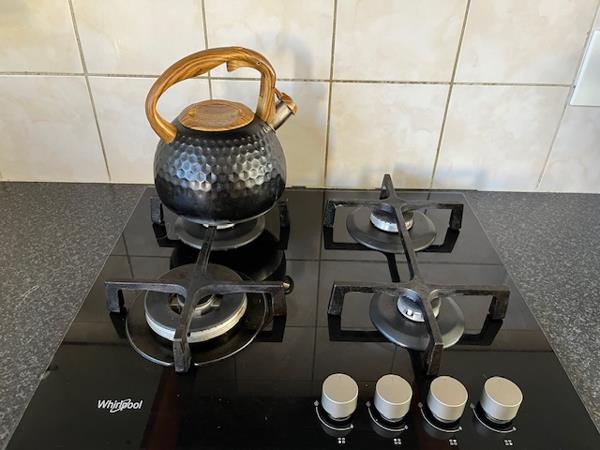 Open plan kitchen with gas hob and electric oven, space for washing machine, and double door fridge.