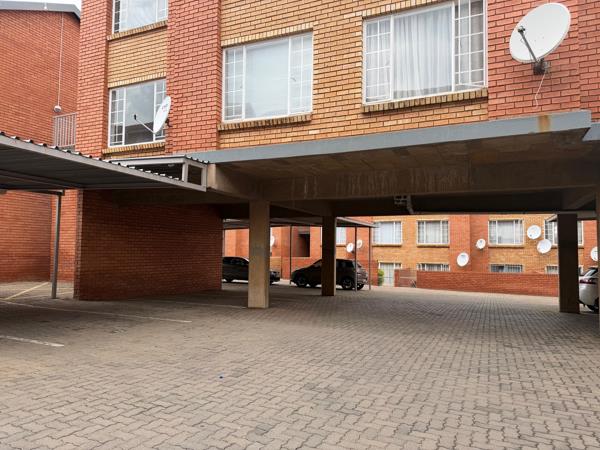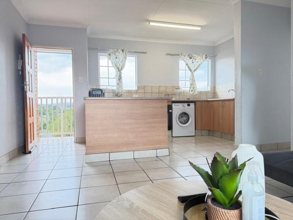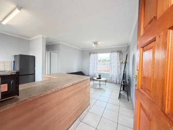 The apartment features a spacious tiled lounge with good natural light, flowing into an open-plan kitchen. The kitchen is practical and well laid out, with ample cupboard space and room for appliances.
