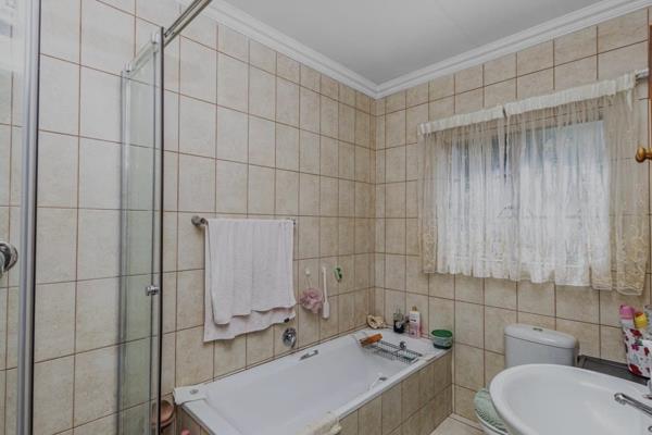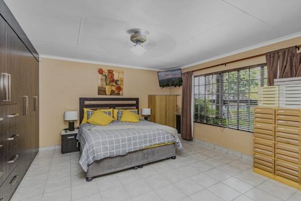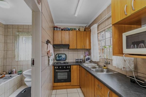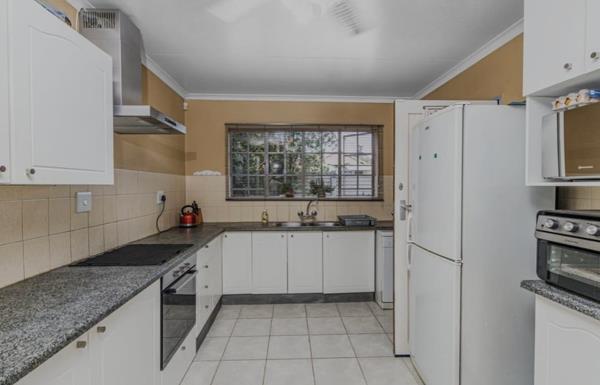Loungedining room area with ample white kitchen cupboards, walk in pantry and scullery.