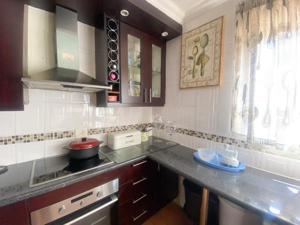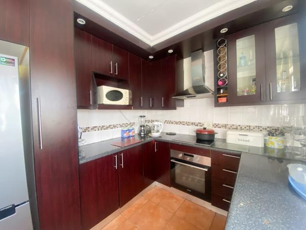 The home features a tiled living room that flows into an open-plan kitchen, fitted with built-in cupboards and tiled flooring for easy maintenance.