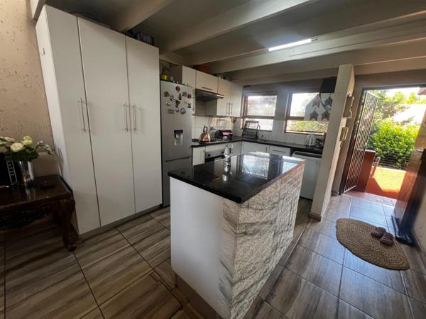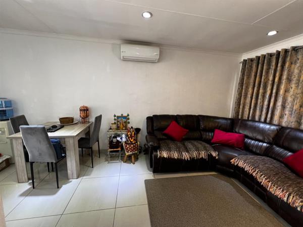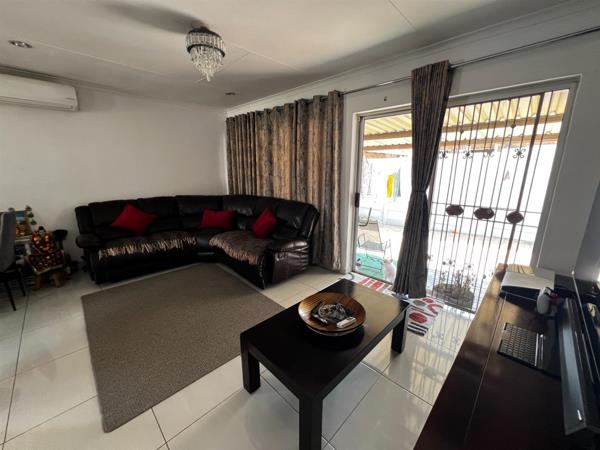 Welcome to this well-maintained and thoughtfully designed home, offering comfort, security, and practical living in a sought-after location. The home features a fully tiled modern kitchen fitted with stylish white built-in cupboards, a stove, double sink, and space for your appliances. The kitchen flows seamlessly into the open-plan lounge, creating a warm and inviting living space. The lounge is neatly tiled, fitted with an air conditioner, and opens through a sliding door, allowing for plenty of natural light and easy indoor-outdoor flow.