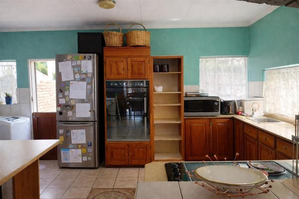 The kitchen is fully tiled and equipped with built-in cupboards, a hob, double oven, and space for appliances, making it both functional and practical for everyday use.