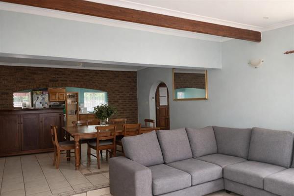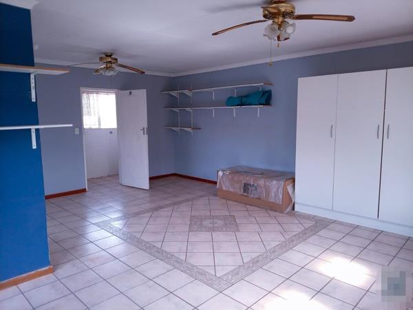 The property includes a garage and a welcoming lounge fitted with tiled floors, roller curtains, and downlights. The dining area is also tiled with roller curtains, creating a neat and modern flow throughout the living spaces.