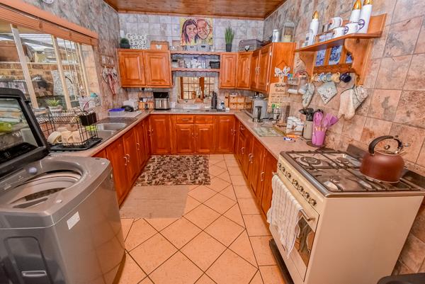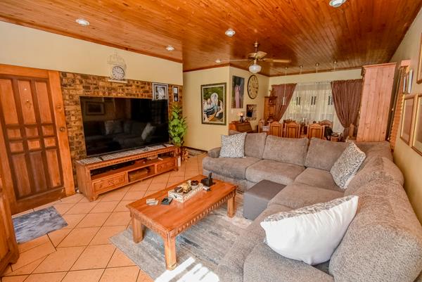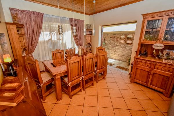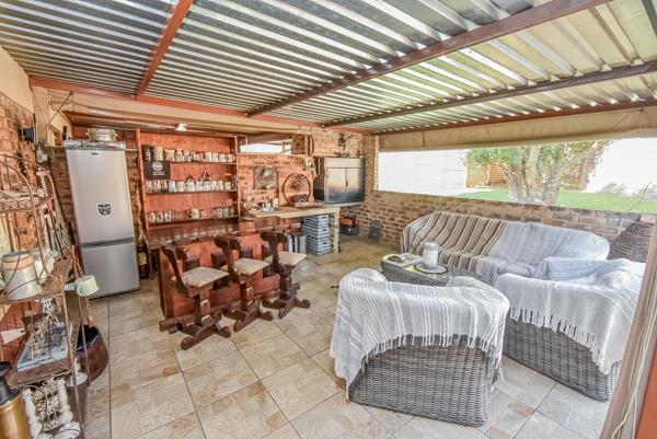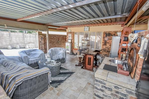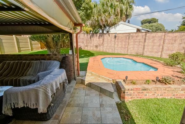 Outdoor living is a standout feature of this home, with three patios in total. One of these serves as an entertainment area complete with a built-in braai, overlooking a sparkling swimming pool fitted with a safety cover. The home is set on a generous 1000m² stand with an established garden, offering plenty of space for relaxation and family enjoyment. A Wendy house in the backyard provides additional storage.