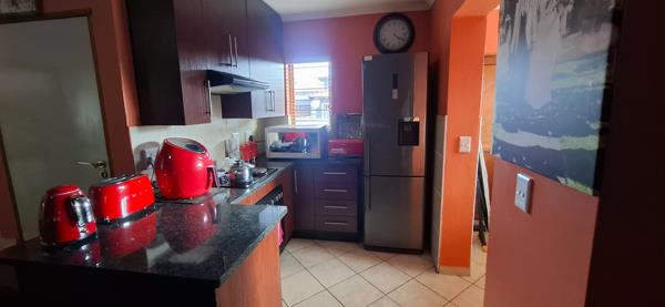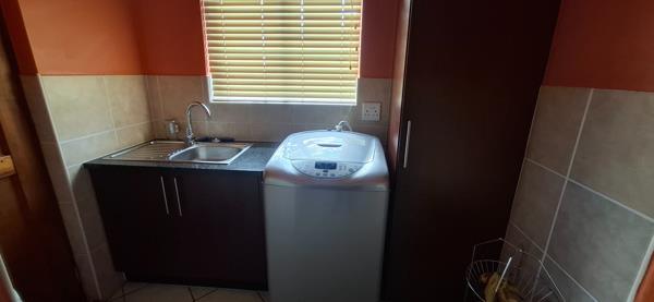 The modern kitchen boasts granite countertops, ample built-in cupboards, and space for a single fridge. A separate scullery provides space for your washing machine and leads conveniently to the outside area.