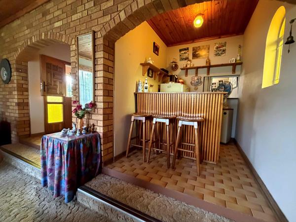 Beautiful kitchen with plenty of cupboard space. The kitchen leads through to a scullery with plenty of space for all appliances, even a double door fridge, chest freezer, washing machine, dishwasher and much more. There is a separate laundry situated next to the garage with a sperate servants quarters with toilet & shower, which could be converted into a flatlet if desired. Great space to add a granny flat for rental potential or space for granny The gardens are beautiful and landscaped and has a borehole and irrigation. Single garage with covered carports, plenty of parking space for five cars.