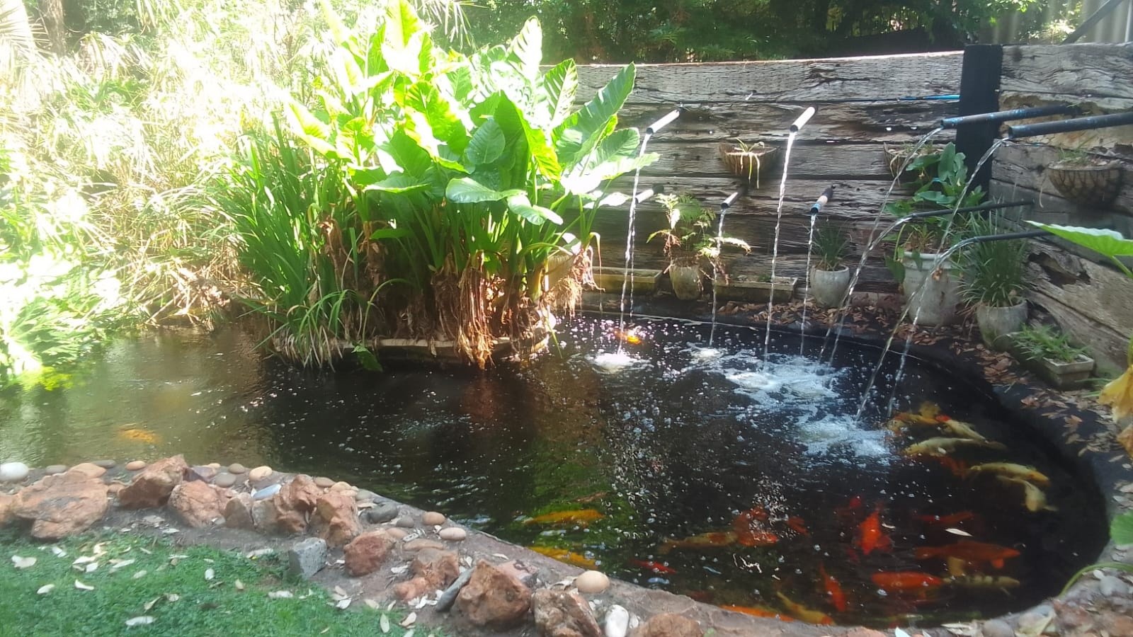 Step outside to an enclosed patio with a built-in braai, leading to a sparkling pool and a dream garden filled with lush greenery. The property also features a lapa overlooking the garden, a self-catered vegetable garden, and a beautiful Koi pond teeming with Koi fish.