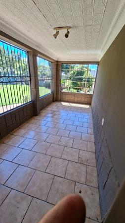 It features three bedrooms, two bathrooms, and a spacious open-plan kitchen and dining area. The large kitchen comes with attractive wooden cupboards, while the lounge offers generous space for relaxation. The enclosed patio overlooks an expansive garden.