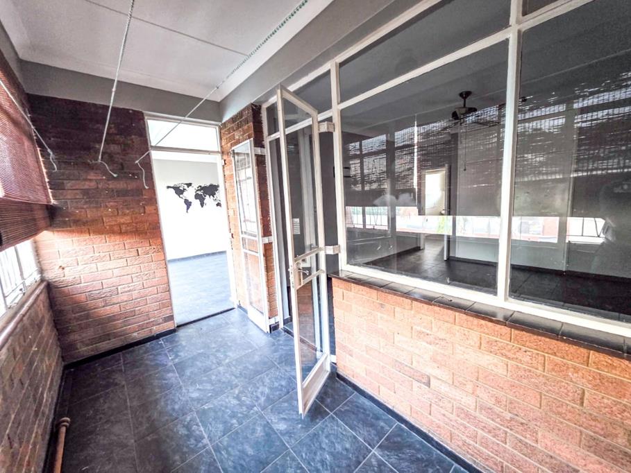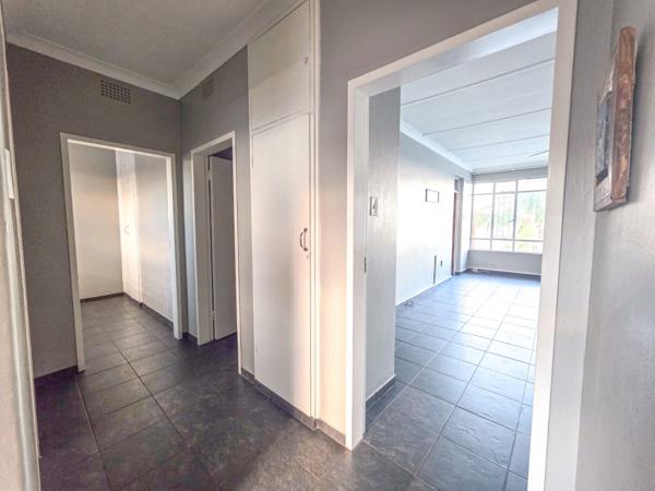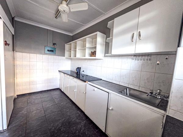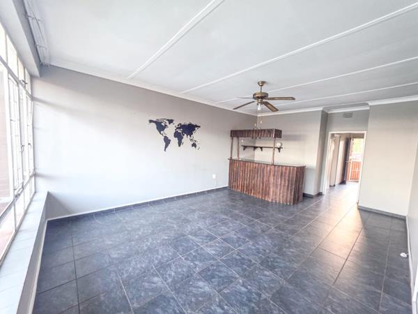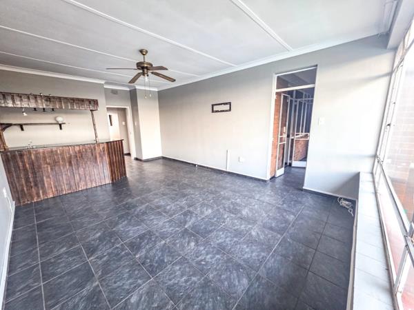 Discover this inviting 88 sqm apartment situated within a secure complex in Valhalla, Centurion. The residence features a functional kitchen equipped with ample cabinetry, dark countertops, and a tiled backsplash, complemented by a ceiling fan for comfort. The open-plan living area is brightened by large windows and boasts durable tiled flooring, a ceiling fan, and a built-in wooden bar, perfect for entertaining. An enclosed sunroom or balcony provides additional versatile space, offering good natural light.