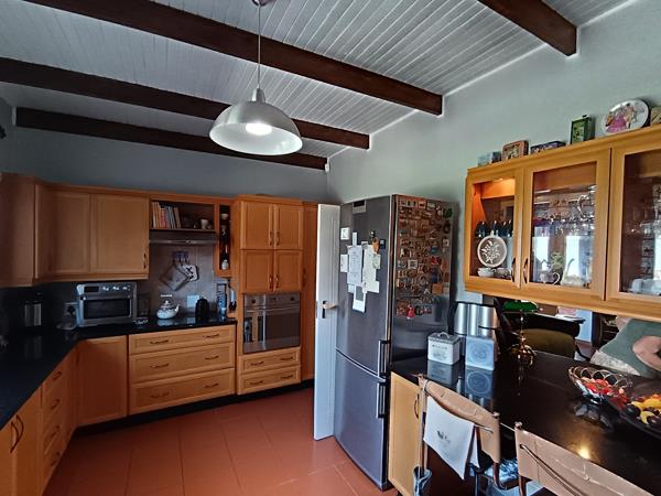 The kitchen seamlessly extends into an additional storage area, providing ample space for extra appliances and added convenience. This versatile extension also offers direct access to the garden.