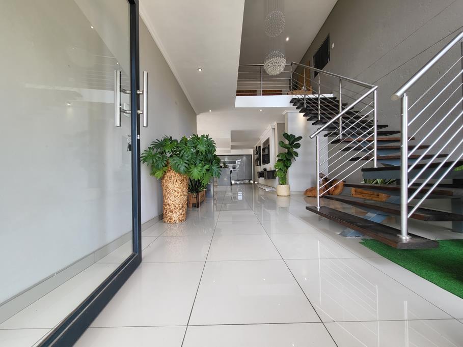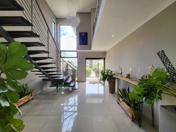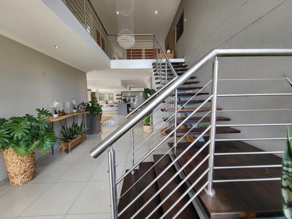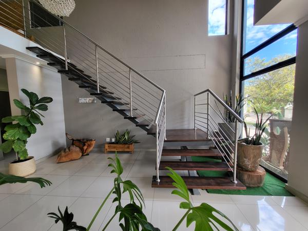 A striking blend of solid wood and steel balustrades, enhanced by natural light pouring in through floor-to-ceiling windows a feature in itself.
