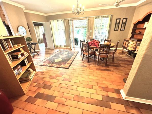 - A Separate open dining room next to the kitchen with ceramic tiled flooring and double steel/glass swing doors with trellis security door to the patio / rear garden.