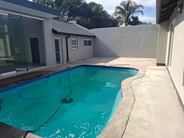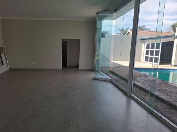 From the entertainment area, large glass doors lead into a spacious formal lounge and dining area, all overlooking the pool. The modern kitchen features ample built-in cupboards and a separate scullery, fully equipped with additional storage and appliance space.