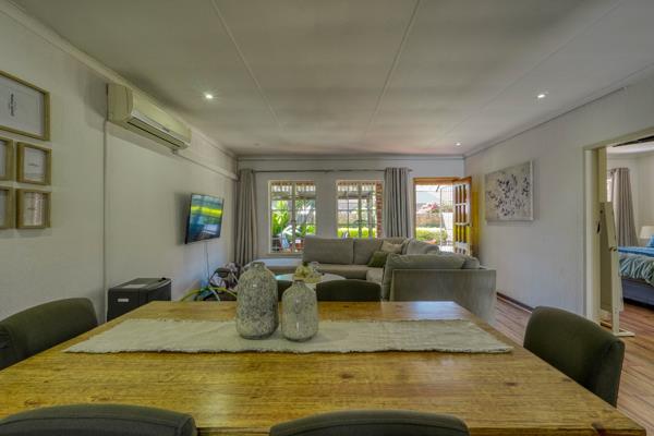 The heart of the home is an inviting open-plan space. To the left as you enter is a neat kitchen with an oven, stove top, and breakfast nook that overlooks the dining and living area. On the right are two doorways leading to the bedrooms. The living area flows seamlessly to a covered patio and private garden, perfect for relaxing or entertaining.