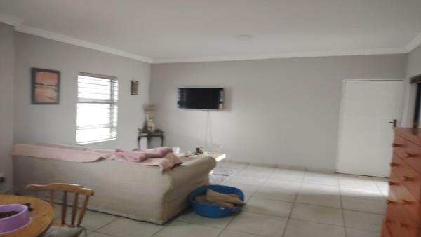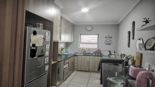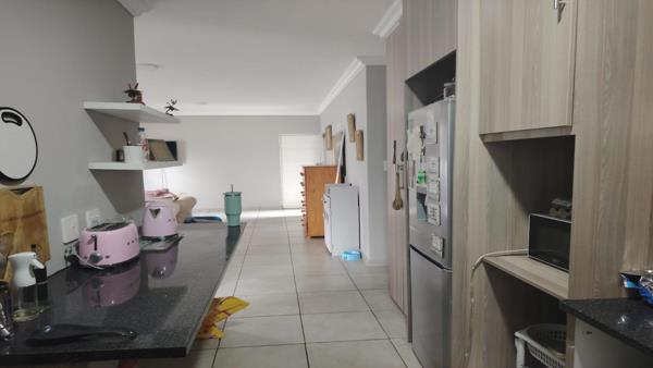 The property offers a Lounge and Dining room that can fit a 6-seater table in an open plan with the Kitchen. The Kitchen brag with lots of built-in cupboards, gas stove and oven and dark granite counter tops.