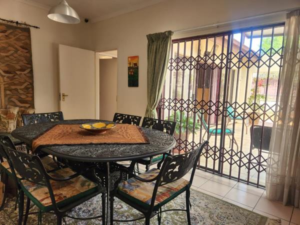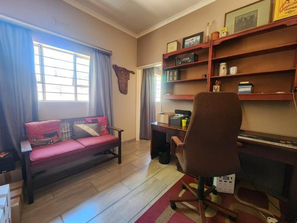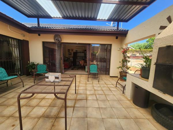 Outdoor living is a delight with a spacious, established garden adorned with mature trees, offering natural shade and a serene atmosphere. The covered patio, complete with a built-in braai, is perfect for year-round entertaining, with sliding doors creating a seamless transition from indoor living spaces. Practical features include a paved driveway leading to three garages, staff quarters, and a dedicated laundry room. The property is totally walled, further enhancing its security.