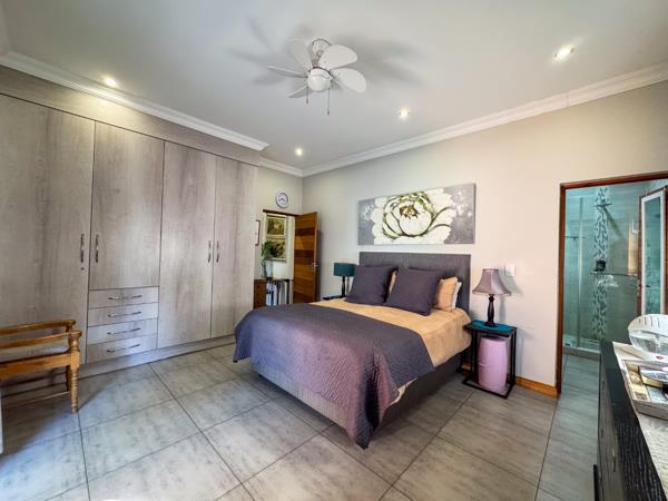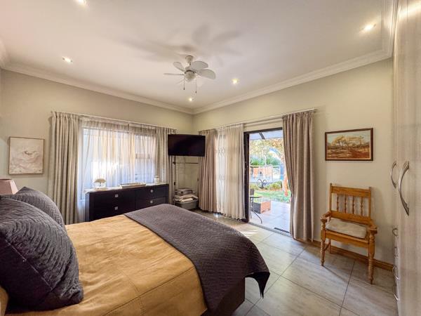 The fourth bedroom, located downstairs, is generously sized with built-in cupboards and an en-suite bathroom comprising a shower, single vanity, and toilet. Sliding doors open to a patio overlooking the garden and sparkling swimming pool.