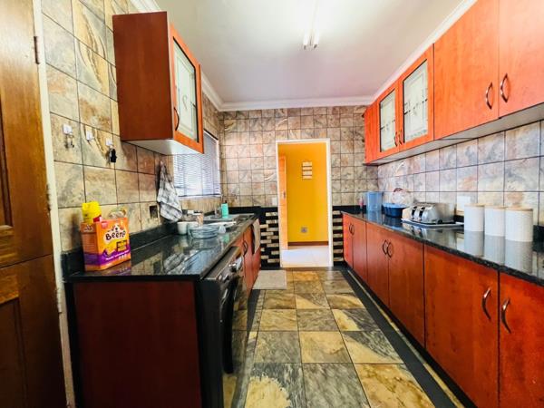 Discover this inviting 3-bedroom, 2-bathroom family home situated on a generous 950 sqm erf in the established suburb of Albertsdal, Alberton. Presenting a classic single-story design with a distinctive red tiled roof and light-coloured exterior, the property offers excellent curb appeal. A large block-paved driveway, complemented by a neatly kept front lawn and mature trees, welcomes you, providing an impressive 15 open parking spaces in addition to the double garage.