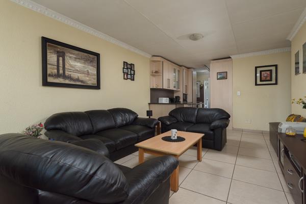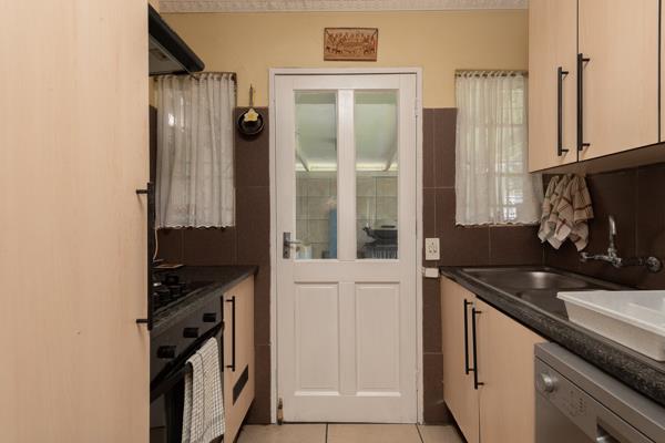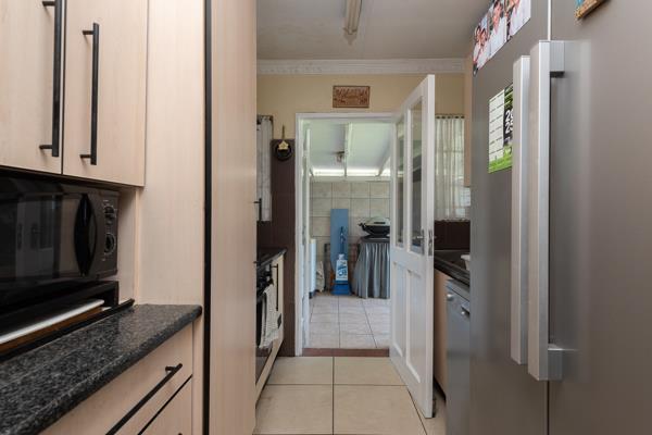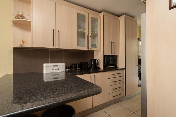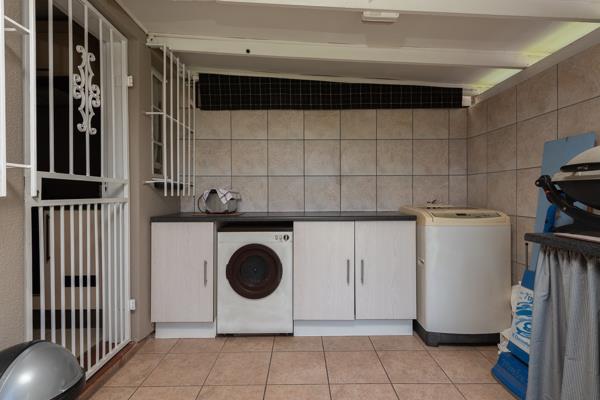 The stylish kitchen is fitted with granite countertops, a breakfast nook, new gas hob, extractor fan, electric undercounter oven, and space for a double door fridge. An enclosed back patio doubles as a fully fitted laundry and covered braai area, perfect for all-weather entertaining.