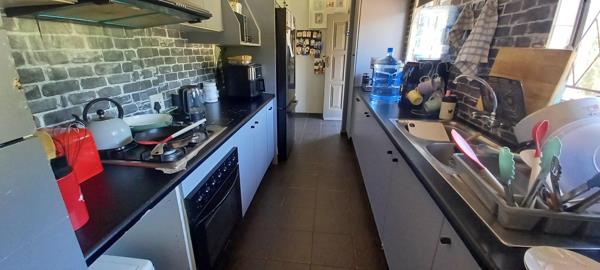 Step inside to discover a functional interior featuring a spacious lounge and a dedicated dining room, both adorned with modern dark tiled flooring and neutral walls, providing a versatile canvas for personal style. The galley-style kitchen is a highlight, boasting contemporary dark countertops, sleek grey cabinetry, and a distinctive brick-look backsplash. Equipped with modern appliances including a built-in oven and stovetop, and illuminated by a large window, it offers both style and practicality for daily living.