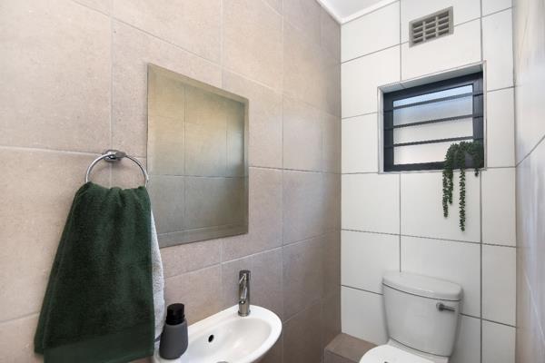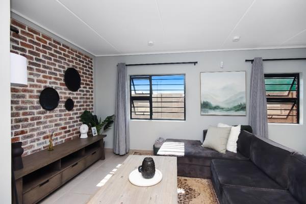 The modern kitchen flows seamlessly into the dining and lounge area, opening out to a covered patio ideal for outdoor dining or weekend braais. A double carport provides secure parking and easy access to the home.