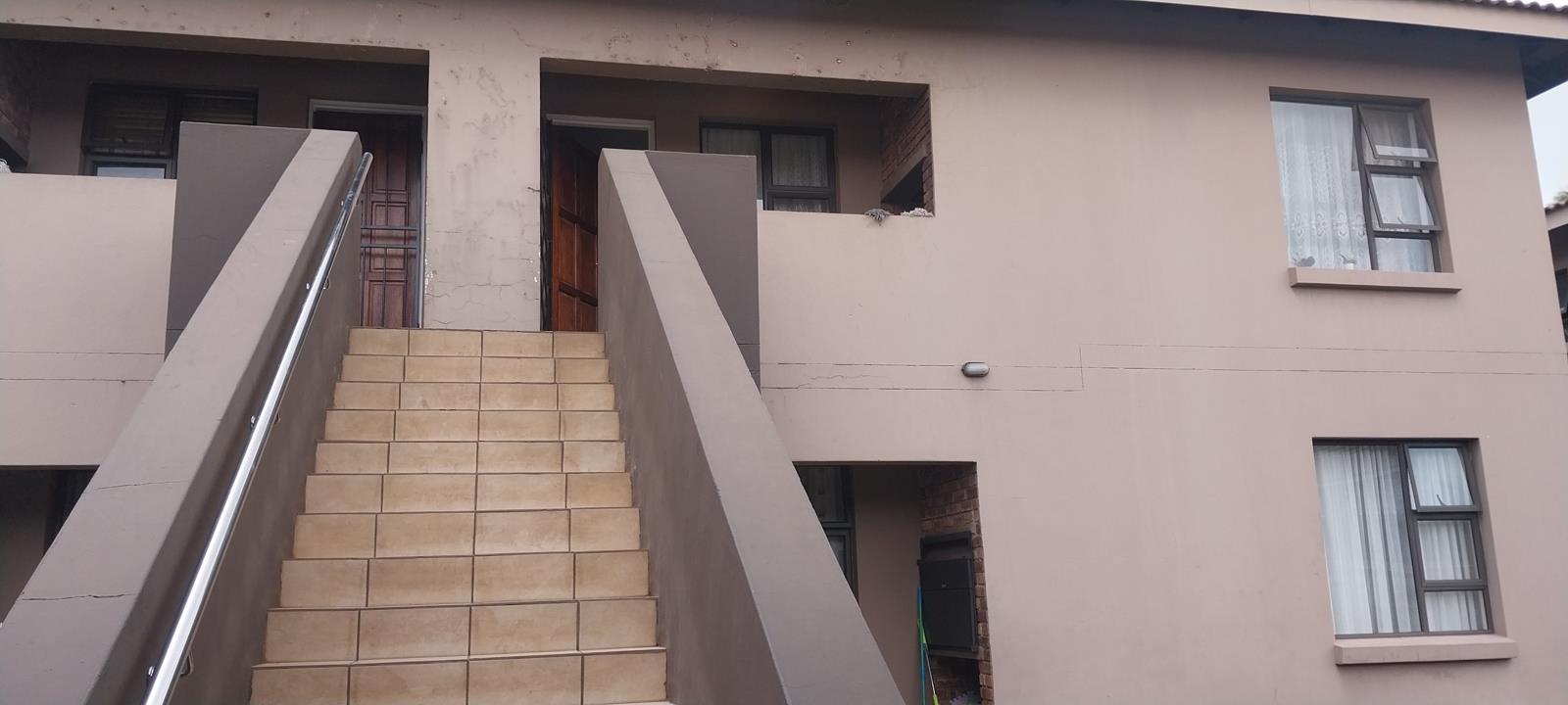 The exterior presents a multi-unit structure with a light brown facade, featuring a central tiled staircase adorned with a contemporary metal handrail, providing access to upper levels. Modern window frames enhance the aesthetic, ensuring a distinct presence.