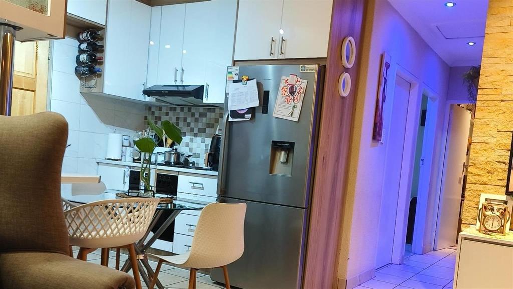 The property boasts an open plan kitchen and lounge area, perfect for entertaining or relaxing with family. The kitchen is equipped with modern amenities, while the lounge offers a comfortable space to unwind. Additionally, the cozy Lapa is perfect for outdoor entertaining or relaxing in the shade. The estates environment ensures peace of mind, making it an ideal choice for those seeking a safe and tranquil living space.