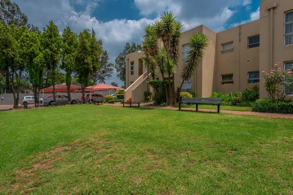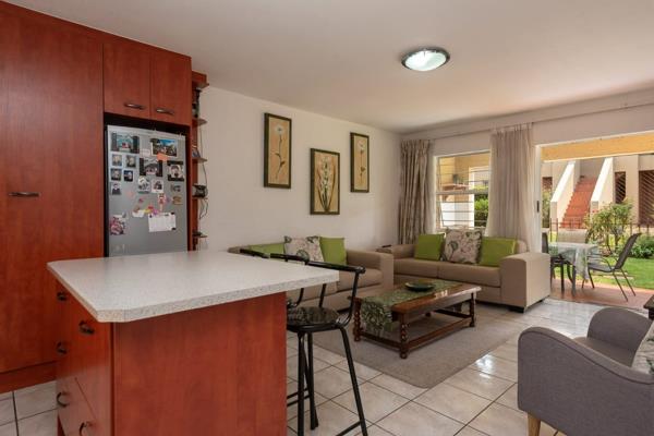 Outside, a well-maintained private garden awaits, complete with a lush lawn and stepping stones. The covered outdoor patio is ideal for al fresco dining and relaxation, offering a seamless indoor-outdoor flow from the living area. Residents also benefit from access to a communal pool, perfect for enjoying sunny South African days. Two dedicated parking spaces are provided.