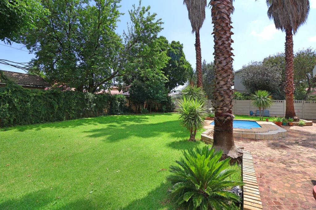 Step outside to a private oasis featuring a sparkling swimming pool, perfect for relaxation and recreation. The pool is surrounded by paving and set within a large, manicured green lawn, complemented by mature palm trees and a private hedge, creating an ideal setting for outdoor gatherings. A patio area extends the living space outdoors.