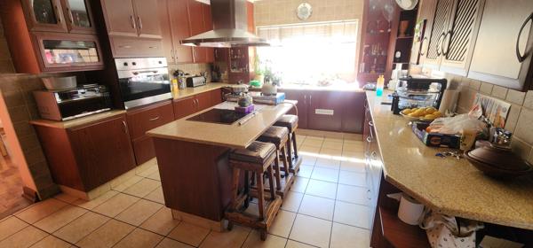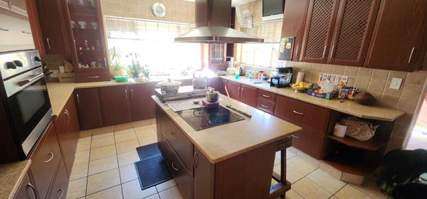 Modern kitchen with island, scullery, and open-plan dining flowing into entertainment spaces