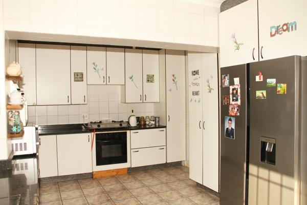 Kitchen with plenty cupboard space, room for a double-door fridge, granite tops