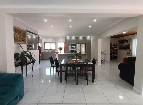 This home offers five spacious bedrooms with built-in wardrobes tiled flooring, three full luxurious bathrooms of which two are onsuite and a guest toilet. The stylish kitchen which is the heart of this home has a scullery with a washing machine and dishwasher connection. An open-plan dining room and lounge area lead into an enclosed entertainment area with a fitted bar and built-in braai area.