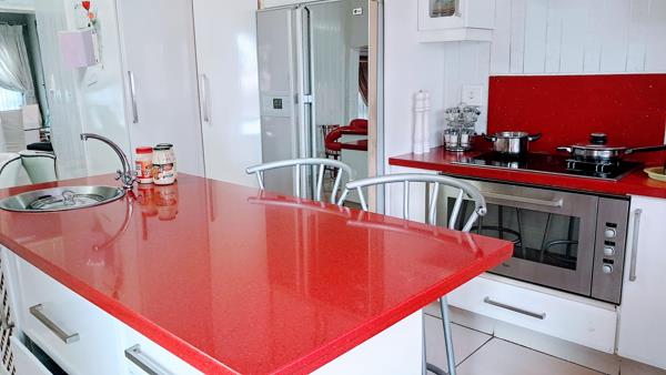 - Gourmet kitchen with stunning red Caesar stone countertops