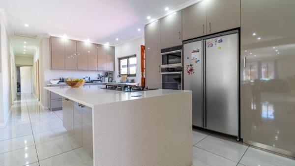 Chefs kitchen with Caesarstone countertops, center island with 5-plate gas hob, undercounter oven, and microwave/oven combo
