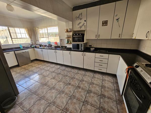 Expansive kitchen with ample cupboard space and workspace practical and well-positioned with backyard access