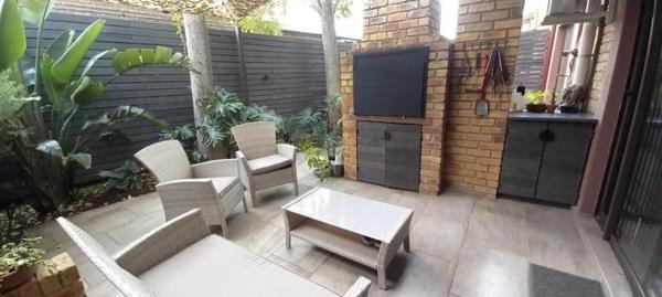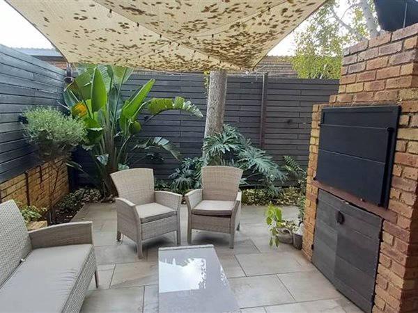 Patio with build in braai overlooking pet friendly garden.