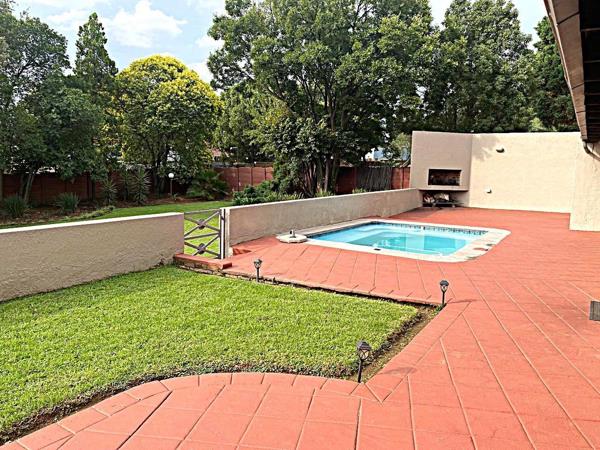 Step inside the main house to find an inviting entrance hall leading to a spacious lounge and dining area, complemented by a large, cozy TV room with a built-in braai, fireplace, and sliding doors that open to an entertainment area next to a sparkling pool.