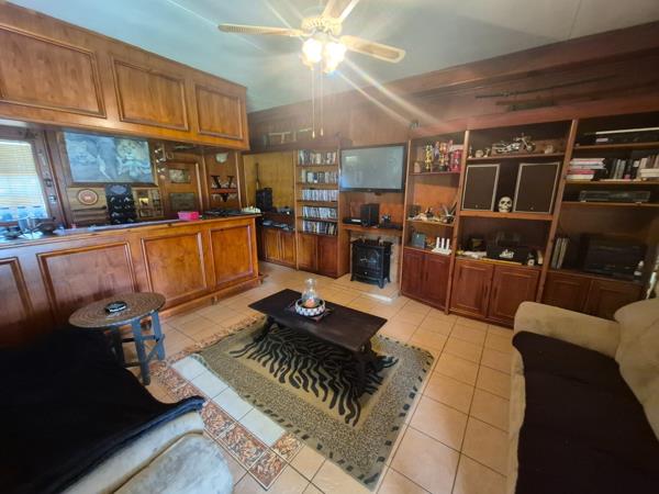 Upon arrival, you are greeted by a well-maintained garden and a defined, tiered flagstone entrance path leading to the single-story residence. The exterior presents a clean facade with functional rain gutters. Inside, the home features a functional kitchen equipped with white cabinetry, grey speckled countertops, and tiled flooring, benefiting from abundant natural light. The property includes a dedicated dining room, a comfortable lounge, and a family TV room, providing versatile living spaces for relaxation and daily activities. An entertainment area, complete with a custom-built bar and extensive shelving, offers an ideal setting for social gatherings.