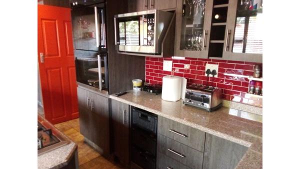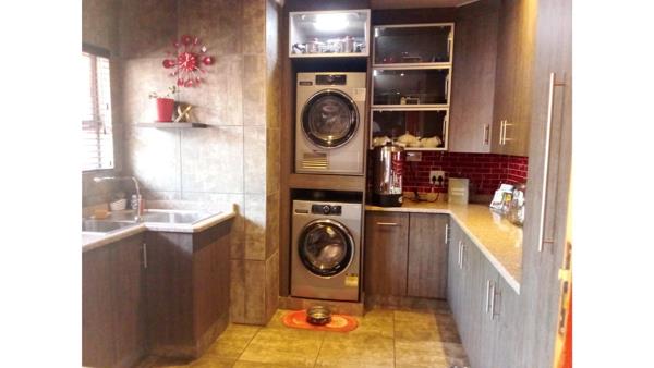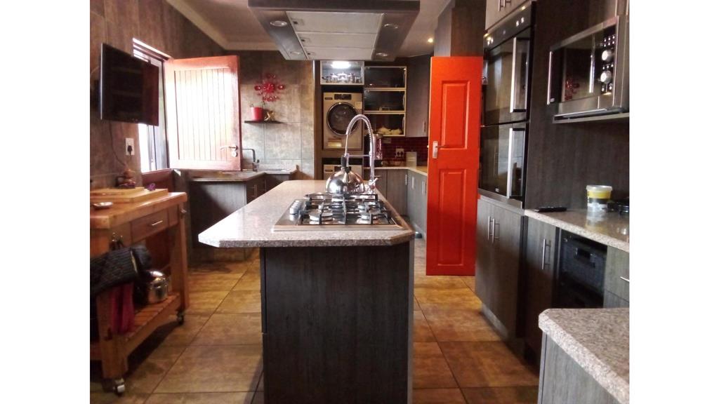 The kitchen is modern, has an island with a gas stove and a splash sink, ensuring quick access when cooking. There is a lot of counter top space, made of granite, and cabinetry ensuring that storage space wont be a problem. There is space for a double door fridge, washing machine and a tumble dryer. There is a double eye-level oven.