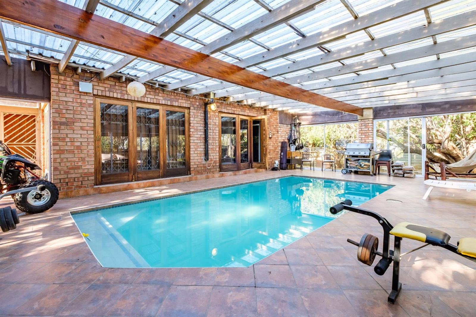 The main house features 3 well-sized bedrooms and a modern open-plan kitchen fitted with a gas oven and ample space for a double-door fridge, flowing easily into the living areas. A standout feature of the home is the indoor swimming pool, perfect for year-round enjoyment, as well as a beautiful outdoor entertainment area ideal for hosting family and friends.