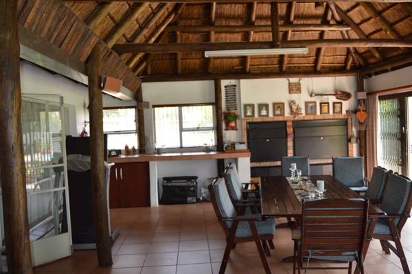 Step inside to discover a beautifully tiled dining room that seamlessly flows into a spacious lounge. A second lounge features a built-in bar, a charming skylight, and a cozy wood-burning fireplace, making it the perfect spot to relax and unwind. The exquisite kitchen is a chef''s dream, boasting granite countertops, a gas hob, and an electric oven, complemented by a separate tiled laundry area for added convenience.