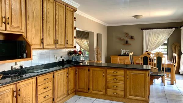 The home features three well-sized bedrooms, each fitted with built-in cupboards, and two bathrooms, including a main en-suite for added privacy. A generously proportioned kitchen provides plenty of cupboard space and a functional layout, making it the perfect hub for family cooking and gatherings.